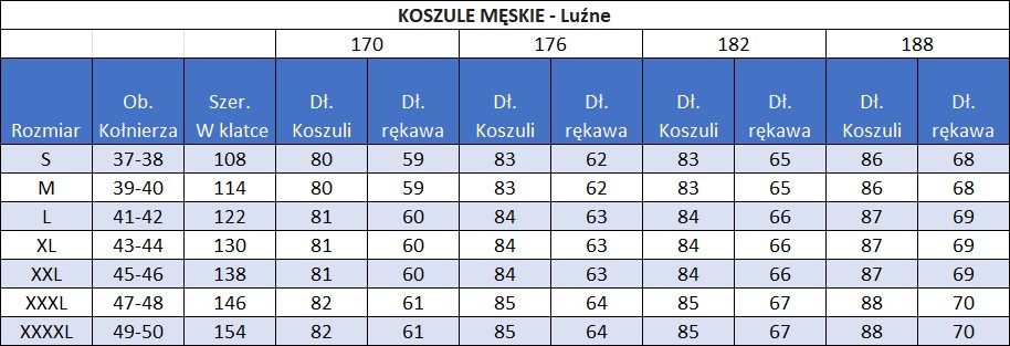 W opisie produktu zamieszczona jest tabela rozmiarów. Tabela zawiera wymiary rzeczywiste koszuli. Najprostszym sposobem na dobór właściwego rozmiaru jest zmierzenie swojej obecnej koszuli i porównanie wymiarów do poniższej tabeli.
